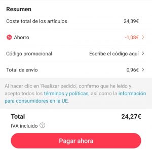 4. En el resumen de la compra, cuando solo tengas que confirmar el pedido, pulsa sobre “Código promocional: Escribe el cupón aquí”.