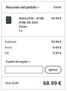 3. Ve a tu carrito de la compra. A la derecha encontrarás el resumen de tu pedido, debajo del IVA podrás pulsar en la opción de cupón de regalo.