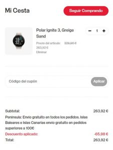 3. Entra en el carrito y pega el código anteriormente copiado en el recuadro “Código del cupón” y aplica.